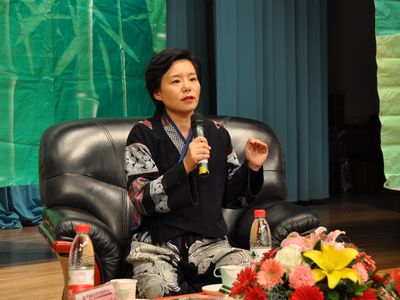 随后,龚琳娜与法大学子现场互动,更使现场气氛达到最高潮。首先龚琳娜教法大学子们从丹田到颅顶的各种发音将声音打开,然后在同学们的强烈要求下,为大家现场演唱了《忐忑》《走西口》等歌曲。龚琳娜富含感情的表演深深地打动了在场观众,获得了法大同学一次次雷鸣般的掌声。