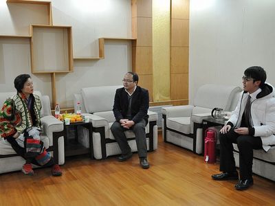 分团委书记管晓立老师在学生活动中心贵宾室内会见了嘉宾龚琳娜,并就本次活动与其进行了亲切的交谈,同时还送上了我院特色纪念文化用品。