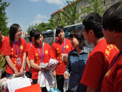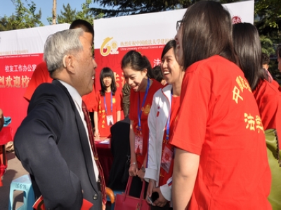院长薛刚凌来到接待处,亲切慰问了在阳光下为校友服务的同学。并表示这是一次很好的接触校友的机会,能够共庆法大甲子盛诞也是一件很幸运的事。希望同学们能够努力做好这次接待工作。