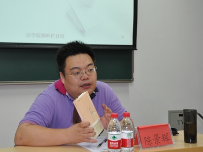 读书会分为四个阶段。在第一阶段“读书报告”中同学们先就书中的观点各抒己见,谈论了对美国国家制度的一些看法。陈景辉教授在第二阶段“嘉宾点评”中主要从“自由”方面阐述了美国的文化氛围,以及其对公私权力的影响。在“师生交流”环节中,同学们与嘉宾就“民主崇拜在美国十几年中是否发生变化?”“中国人与美国人在被告人与被害人中的带入心理为何不同?”等问题展开讨论。陈景辉教授幽默的语言,睿智的回答获得了满堂的欢笑与掌声。最后,在“嘉宾总结”中陈景辉教授对整本书做了点评,并告诫大家对身边的看似合理的事物应常常抱有反思的态度。