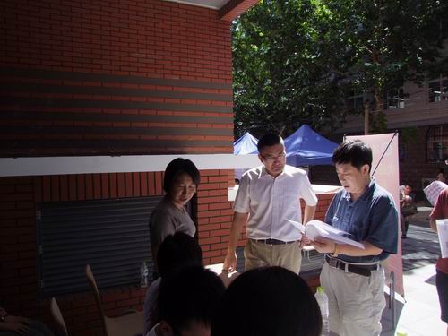 负责研究生迎新的老师和志愿者就早早来到综合科研楼东侧迎新场地,张贴分班名单、在醒目处发布报到手续的流程,以提高办理手续的效率。