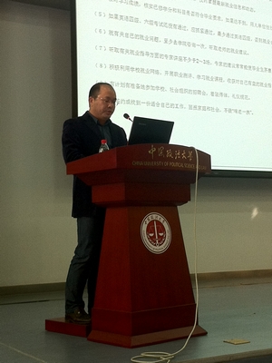 徐庆针对2013届毕业生就业形势与政策作了详细的说明与分析,引用大量的数据材料、对比信息,直观地展示了往届就业形势的整体状况和发展趋势。徐庆指出,毕业生普遍对公务员报考热情高涨,对“选调生”、律所等就业机会缺乏关注和重视,导致“一方面工作不好找,一方面工作没人要”局面的出现。他强调,就业过程中要排除不当心理因素的干扰,尤其是来自父母传统就业指导思想的压力,要树立就业新观念,开辟更多的可发展空间。此外,徐庆还为毕业生解读了国家对大学生就业的指导政策,向毕业生提出了搞好就业的4点要求和10点建议。