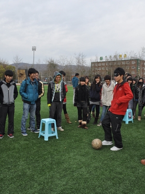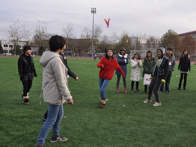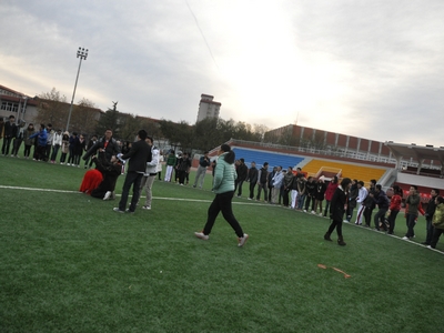 在两位主持人以幽默诙谐的方式做了开场介绍并宣布趣味运动会开始之后,学生会的九个部门被分为A、B、C三个组分别进行比赛。在组织者的带领下,大家以极高的热情开始了这次活动。第一项比赛“盲人射门”,由两人搭配进行蒙眼射球,在欢笑与喝彩之中,各部门默契感急速上升,为活动的进一步开展铺陈了欢乐和谐的氛围。接下来进行的“八人毽球”和“向我开炮”两项比赛,各部门在激烈的竞争中都表现出色,笑声不止,趣味无穷。比赛项目“气球快跑”可谓是此次运动会的重头戏,每个部门派出了4对选手参加,每对选手面对面夹着气球在足球场上完成一个来回的走动,在这个极其需要参赛者之间默契的运动中,学生就业与发展中心和外联部表现得十分突出。最后“八人九足”比赛中,大家的情绪达到最高点,点燃了青春里最热情洋溢的年华。