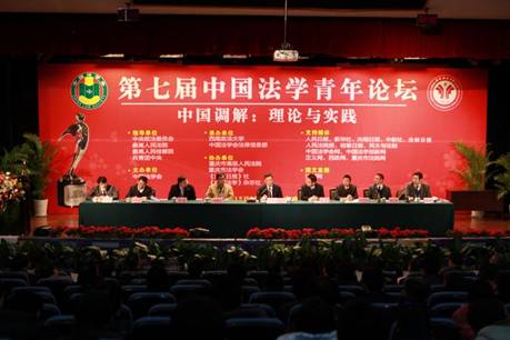本届论坛以“中国调解:理论与实践”为主题,由中央政法委员会、最高人民法院、最高人民检察院、共青团中央作为指导单位,中国法学会主办,西南政法大学和中国法学会法律信息部共同承办。中国法学会党组成员、副会长李清林,最高人民法院副院长江必新,最高人民检察院检委会副部级专职委员童建明,重庆市高级人民法院院长钱锋,中央政法委综治二室主任陈显辉等领导出席论坛并讲话。通过全国征文活动遴选产生的12位青年法学法律工作者,与中央政法委、全国人大法工委、最高人民法院、最高人民检察院、司法部、中国法学会以及北京大学、清华大学、中国人民大学、复旦大学等高校的知名专家学者,针对“调解的一般理论和大调解机制”、“法院调解和人民调解”、“刑事和解、行政诉讼和解及劳动争议调解”等三个专题进行了热烈深入的交流和讨论。论坛指导单位、协办单位的领导、来自法学理论和实践部门的专家学者、论文获奖作者、优秀组织单位代表、重庆市法学、法律工作者代表和西南政法大学的师生近400人参加了论坛。