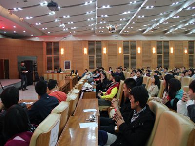 在主持人简短的开场白后,党巍就以极限马拉松为主题的户外题材纪录电影做了概括介绍。在讲演中她提到,户外题材的记录电影最大的特色就是其呈现的场景是直接而纯粹的,不加任何修饰的成分。对于目前中国户外记录电影的发展现状,党巍表示,优秀摄影师的稀缺与制作流程的不完整是制约其发展的主要原因。尽管中国户外电影还有一段很漫长艰辛的道路要走,但前路仍旧是光明与广阔的。在讲话最后,党巍诚挚邀请有语言,摄影,策划,创意等特长的同学加入他们的创作团体,为同学们提供了一个发展、提升自我的机会。