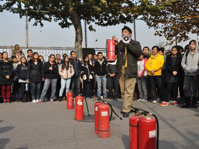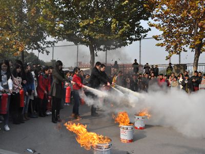 接下来,保卫处的两位老师分别就火灾发生的原因及灭火器的使用方法为同学们进行了详细的讲解。提到火灾发生的原因时老师指出,各大高校宿舍楼火灾的发生大都是由电路起火引发的,所以提醒同学们要提高防范意识,避免使用违章电器并注意平时的用电安全。讲到灭火器的使用方法时,老师要求同学们准确、熟练地掌握“提”、“拉”、“瞄”“压”四个动作要领:“提”即提起灭火器;“拉”即拉下保险环;“瞄”即对准火心;“压”即压下灭火器。老师讲解示范后,同学们都进行了实际操作,亲身体验了灭火器应当怎样正确使用。