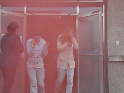为了模拟火灾现场,还人为地在宿舍楼制造了烟雾,于12时45分,警报声拉响,同学们都迅速从寝室跑出来,并有序地从安全通道疏散撤离,两分钟后,所有同学都在学校东门集合完毕。
