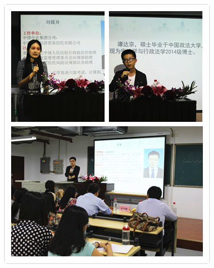 接着,八位优秀毕业生分别从学业、求职与生活等方面进行了经验分享。其中,就职于北京市人民检察院第三分院的何湘以幽默风趣的语言告诉大家要打好专业基础,同时培养兴趣爱好,处理好与老师、同学的关系,珍惜研究生生活;就职于北京市东城区人民检察院的张家祥对检察院的工作生活进行了详细的介绍,并鼓励大家多参加活动,拓展自己的朋友圈;毕书勤则从她在北京市丰台区人民法院的工作体验出发,为我们介绍了法院生活,并提醒在座各位尽早进行职业规划;来自北京市国枫凯文律师事务所的付丽文以及北京市兰台律师事务所的赵宝玺分别以自己的律所工作经历向大家生动地再现了律师生活;王冬则从就职信息获取、投递简历、笔试与面试等四个方面分享了其成功就职金融国企的宝贵经验;工作于中国对外经济贸易信托有限公司的刘载舟从目标定位、就职前期准备、实习和面试这几个方面出发进行陈述,获得了场内一片好评;顺利考取我校博士的谭达宗则提醒大家应充分利用北京资源,多听讲座,学好专业知识,提升自我。