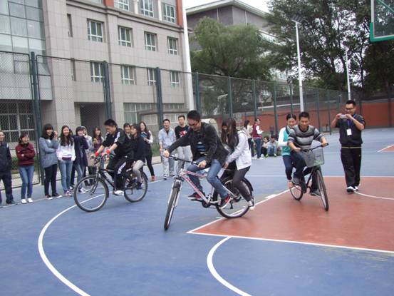 趣味运动会的第三项是载人慢骑,每班派出一男一女共乘一辆自行车。要求自行车沿直线慢速前进,后到达终点者获胜。在缓慢的骑行中,如何保持平衡、控制车速并保证车子不停,这些都是对选手们车技的巨大考验。