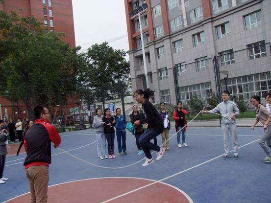 接下来是精彩的跳大绳比赛。每个班级选派10人参加比赛,参赛人员循环跳入绳内,两分钟内跳过大绳的人次最多的队伍获胜。