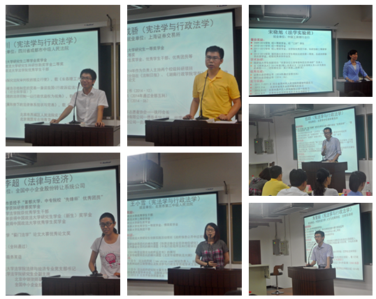 即将就职于四川省成都市中级人民法院的卢小川,用改编版守株待兔的故事告诉同学们一定要提前规划好自己的职业生涯,同时要能敏锐地发现市场需求;做好选择后,再进行科学有效的努力,脚踏实地走好人生的每一步。签约北京市第三中级人民法院的王小雪谈到,求职需有坚定的信心,明确的目标以及一定的承压力;然后向大家分享了其公务员笔试和面试方面的经验。签约上海证券交易所的沈成骄,详细介绍了其理论准备阶段、实习阶段及最终寻找工作阶段的心路历程和每个阶段的努力方向。即将供职于全国中小企业股份转让系统公司的李超和签约中国工商银行总行的宋晓旭建议同学们要尽早求职,根据自己的兴趣爱好抓住暑期实习的机会;注重保持平常心,不计较一时得失,从容面对可能的挫折。签约北京市中伦律师事务所的伍昉则主要介绍其在律师实习、求职和读研期间出国交流方面的经验,勉励同学一定要管理好自己的时间,注重完善自身的知识结构等。博士生朱智毅选择在中国农业大学做一名法律系讲师,他提到要对自己的能力与兴趣有精确的判断,明确职业方向,并详细介绍了高校教师招聘的一些要求。获得“优秀毕业论文”荣誉并选择继续读博深造的吴然,分享了其考博和论文写作两方面的经验:一旦选择读博,定要明确读博的目的;另外,在论文写作过程中要积极主动与导师沟通,注重选择合适的题目等等。