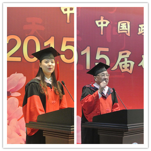典礼开始前,播放了一段精心制作的毕业纪念短片。应松年、刘大炜、何兵、许身健、刘纪鹏等领导与教授的谆谆教诲,让毕业生们感受到老师的关怀与爱护;而各毕业班的学习生活照片剪影,则带领大家从2012年入学开始,回顾了过去三年的点点滴滴。在场的同学时而欢呼,时而感伤,沉浸在对法大的无尽回忆和留恋中。