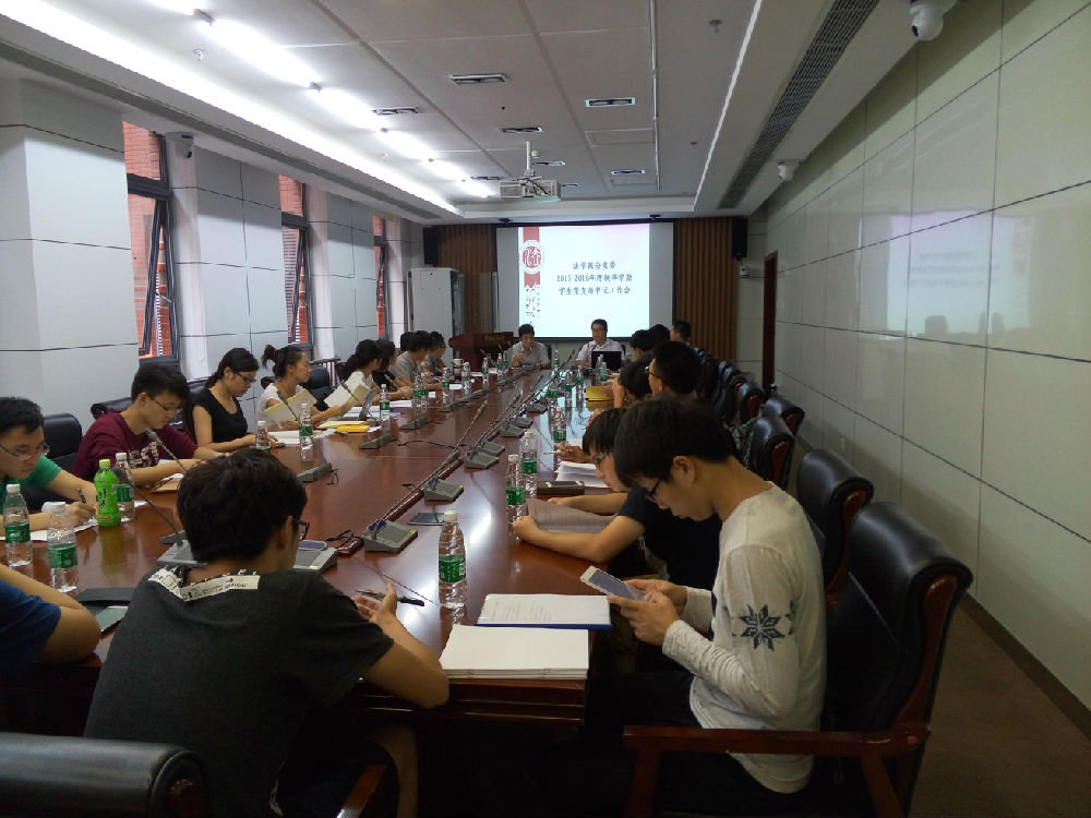 2015-2016年度秋季学期第一次学生党支部书记工作会。会议由分党委书记刘大炜主持,分党委组织员王琦、辅导员樊昌茂及本科生、研究生全体学生党支部书记出席会议。