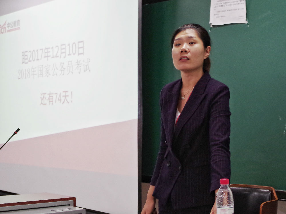 随后,刘怡然对近年来公务员考试的情况以及职位选择进行了详尽的分析,并针对其中的关键问题进行了主要说明。其后,刘怡然对行测命题形式及解题技巧进行了深入的分析、指导,并与台下同学进行互动,大会气氛达到高潮。最后,刘怡然对同学们进行了解题策略方面的指导,帮助同学们做到心中有数、有的放矢。