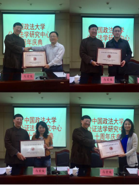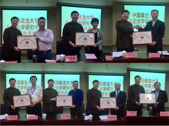 会上马宏俊主任、周志扬主任和朱绵茂副院长一起为昆明市明信公证处段伟主任、四川省律政公证处李勇主任、北京市中信公证处王明亮主任三位研究员颁发了优秀研究员证书,肯定了他们三位主任长期以来对中心工作给予的帮助和无私的支持。从2017年开始中心将着力于建立公证法学课程毕业的研究生与各地公证处之间的实践基地平台,为有意向从事公证工作的研究生推荐去各地公证处实习就业的机会,也为各地公证机构推荐更多的优秀法学研究生。感谢第一批支持这项工作的各公证处:北京市方圆公证处、北京市东方公证处、河北省燕赵公证处、山东省齐鲁公证处、陕西省汉唐公证处、四川省律政公证处、昆明市明信公证处,哈尔滨市哈尔滨公证处、南京市南京公证处、安徽省六安皋翔公证处、山东威海威海卫公证处,也希望有更多的公证处加入到我们这样一个双向选择的实习就业平台来,让公证队伍的后继人才越来越优秀,让公证队伍越来越壮大,让公证的明天充满朝气!