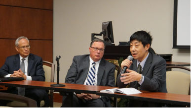 刘大炜教授、王建芹教授,加州浸会大学Jar Orr教授、Steve Harmon教授分别进行了发表主旨发言。共同探讨了中西方不同历史中德治与法治的根源,以及现代治理中对德治与法治的融合与应用。研讨会期间,双方特别就习近平总书记提出的依法治国与以德治国相结合的中国特色社会主义法治道路进行讨论,美国学生积极提问,对中国的德治与法治发展建设兴趣浓厚。